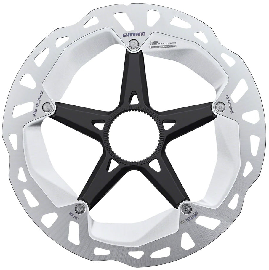 Deore XT grade RT-MT800 Ice Tech rotors give excellent performance made from a stainless steel / alloy 3-layer sandwich construction that manages heat while riding The clad steel / alloy / steel rotor construction allows heat generated from braking to radiate quickly through the aluminium core achieving surface temperature drops of around 50 deg C. When used with Ice Tech pads surface temperatures can drop from around 400 to 300 deg C, this provides great improvements in performance all round Ice Tech rotors achieve long pad life, less noise and less fade due to improved heat dispersion Using the proven Shimano Center Lock system for excellent rigidity and security with an easy set-up Rotor contact surface has been developed for excellent pad clearing and cooling which increases pad performance and life Large forged alloy spider supports rotor surface, increasing rigidity and reducing weight Comes complete with alloy lockring