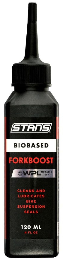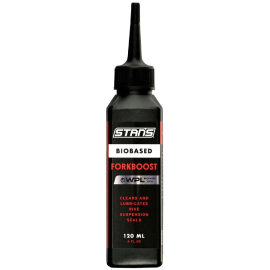 Stans Biobased ForkBoost, a suspension game-changer, lubricates and cleans bicycle suspension seals - banishing stiction, removing dirt, and extending seal life. Just apply it to the dust seals, pump the suspension, and wipe away the grime. Its harmless to rubber and plastic, ensuring no damage, swelling, or cracking. Use Stans Biobased ForkBoost internally during fork rebuilds to soak foam seals and cut grease to the perfect thickness. Keep your ride smooth, responsive, and trail-ready with Stans Biobased ForkBoost.